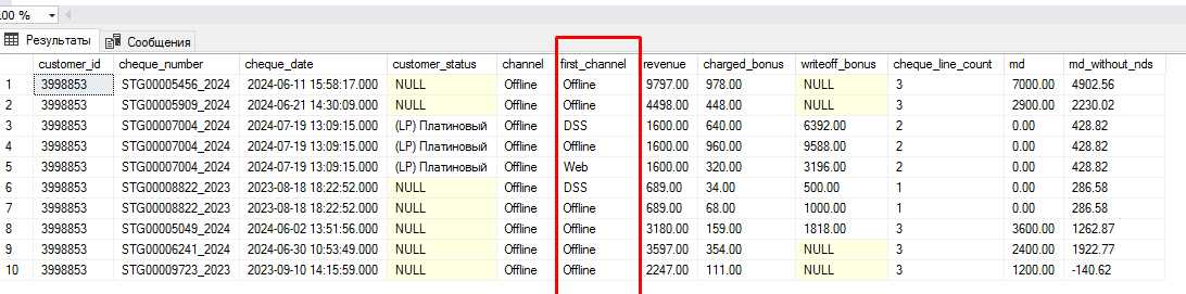 С другой стороны пример, клиент customer_id = '3998853' и чек order_hash_key = '39590C65-6675-1C48-58E6-001C9C80FD5E'. Точка контакта в [Mindbox].[main].[S_orders] = 'DSS', указан check_number_1c, при этом в report2 подтянут канал Offline.