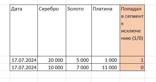 Предположим, на дату 17.07 было 12000 клиентов с золотом. Что в этом случае будет в столбце "Попадал в сегмент к исключению (1/0)" ? Какое значение будет 1 или 0 ? или будет кол-во клиентов попавших в исключающие списки? Тогда почему написано 1/0?