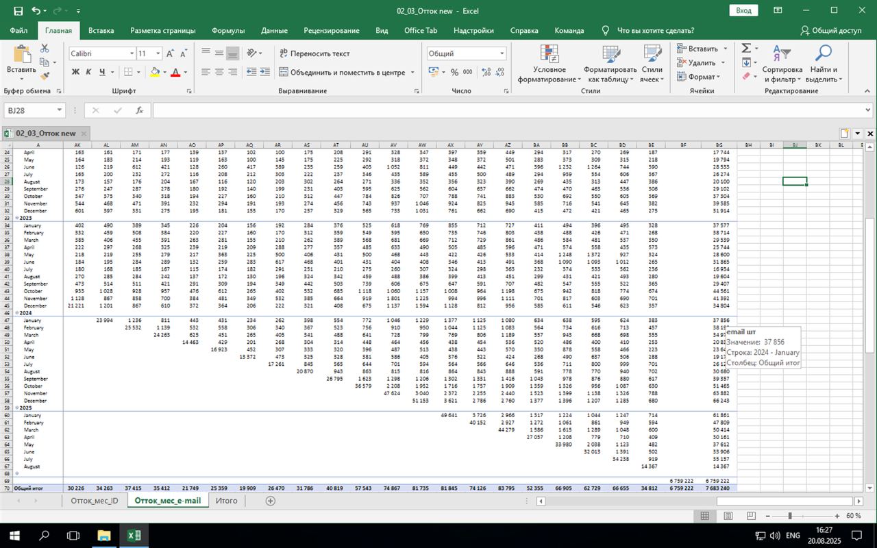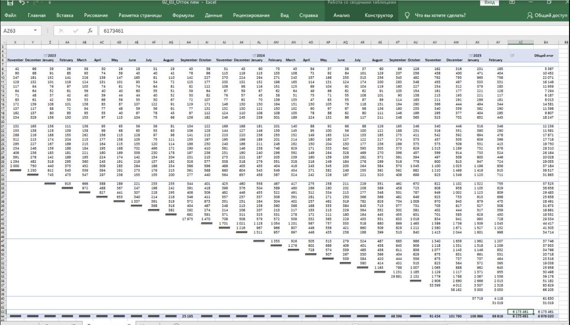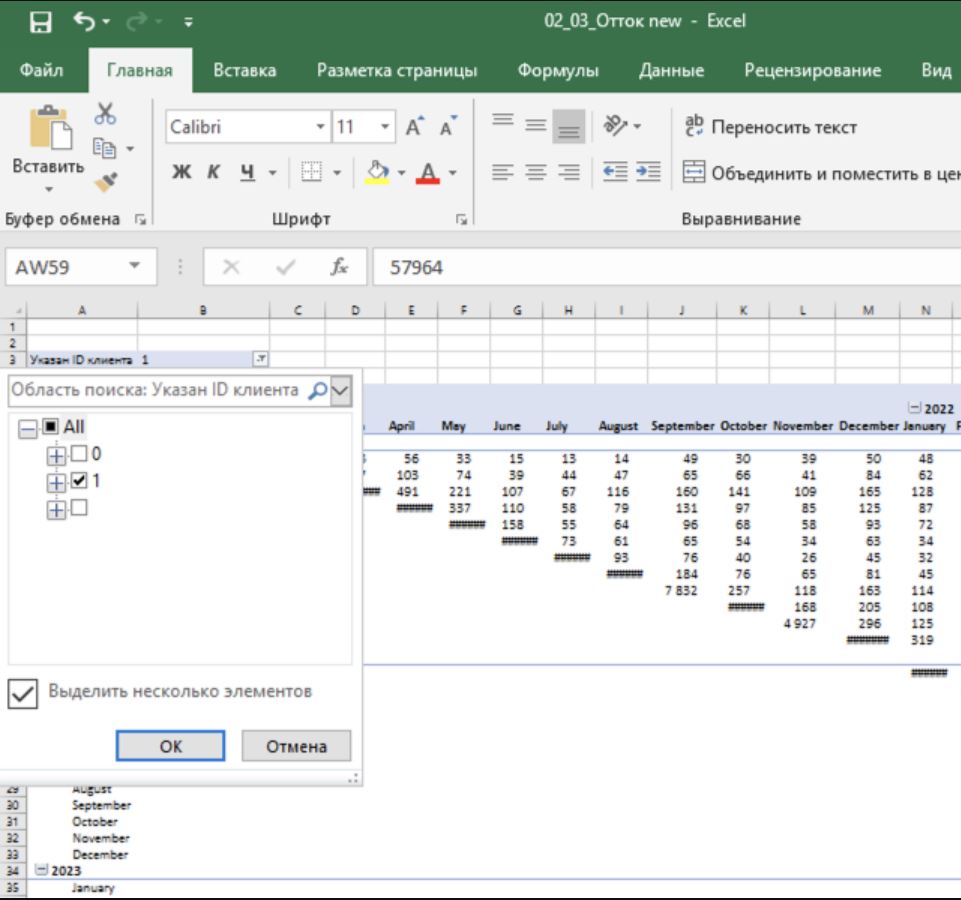2. Количество клиентов совпадает в обоих отчетах. Просто в отчете Оттока нужно смотреть не одну ячейку за декабрь 2024, а общий итог по строке за декабрь 2024. Верное значение 65831.