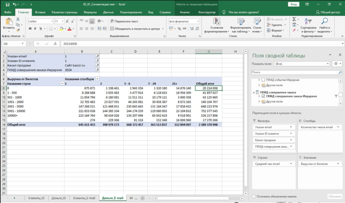 Перенастроила отчет 02_01_Сегментация new вкладка Деньги_E-mail. На скрине отчет, который показывает выручку от билетов по заказам сайта, в которых указан email и ID клиента за 2024 год.