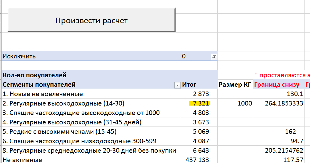 Мы с Юлей делали доп.вкладку "Выгрузка сегмента" в сегментаторе, чтобы можно было напрямую выгружать оттуда клиентов, там показывает 7321 клиента в этом сегменте.