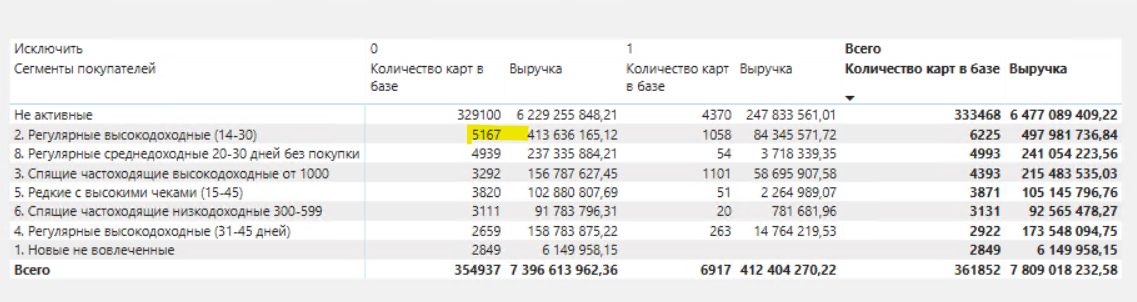 В сегментаторе Флории сформировала сегменты. В сегмент "регулярные высокодоходные" попадают 5167 клиентов.