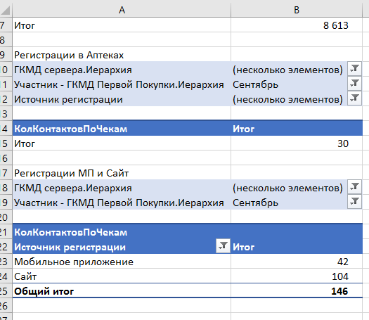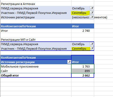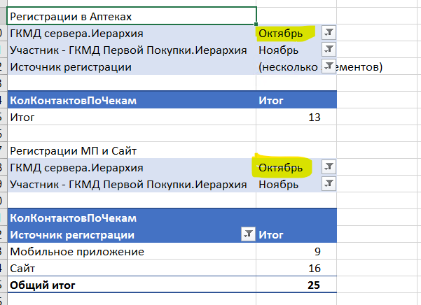 Сформировала отчет за ноябрь. В файле "рекрутинг МЦ 2" на вкладке "Куб" в кубе "Регистрации в Аптеках" и "Регистрации МП и Сайт" в ячейках B10 и B18 не обновился месяц отчета (остался октябрь, а должен быть ноябрь). Прошу починить.