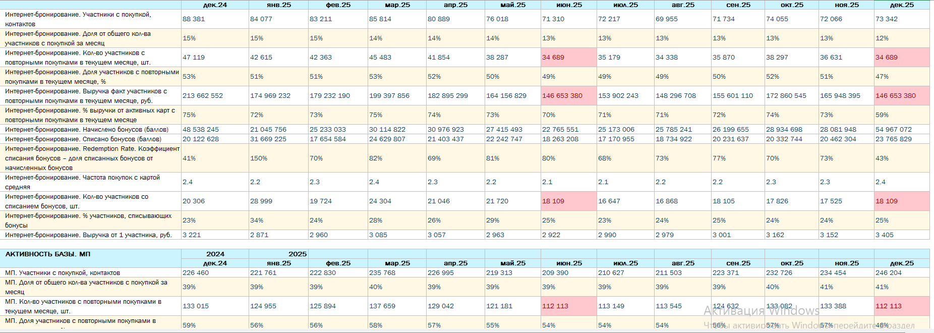3. Вспомогательные файлы по активности базы обновились, но в отчет по Ключевым показателям - вкладка "Активность базы" данные не подгрузились (ячейки AK78,82, 89, 91, 94, 105-107, 146, 148, 154, 162, 164, 170, 178, 180, 186, 193, 195, 197, 198). В указанных ячейках почему-то появились данные за июнь 2025 г. Скриншот прилагаю