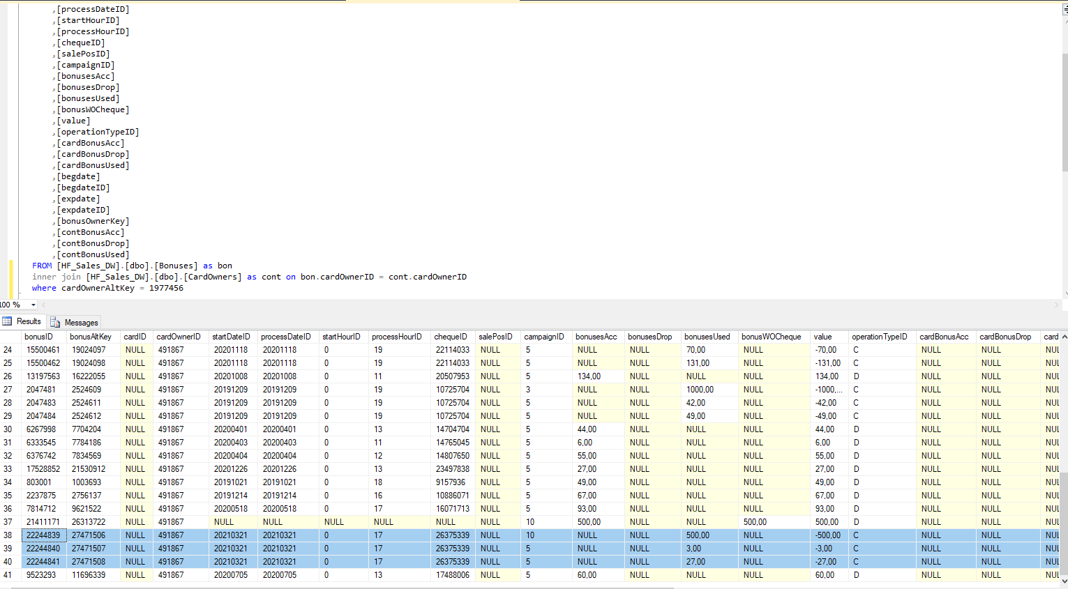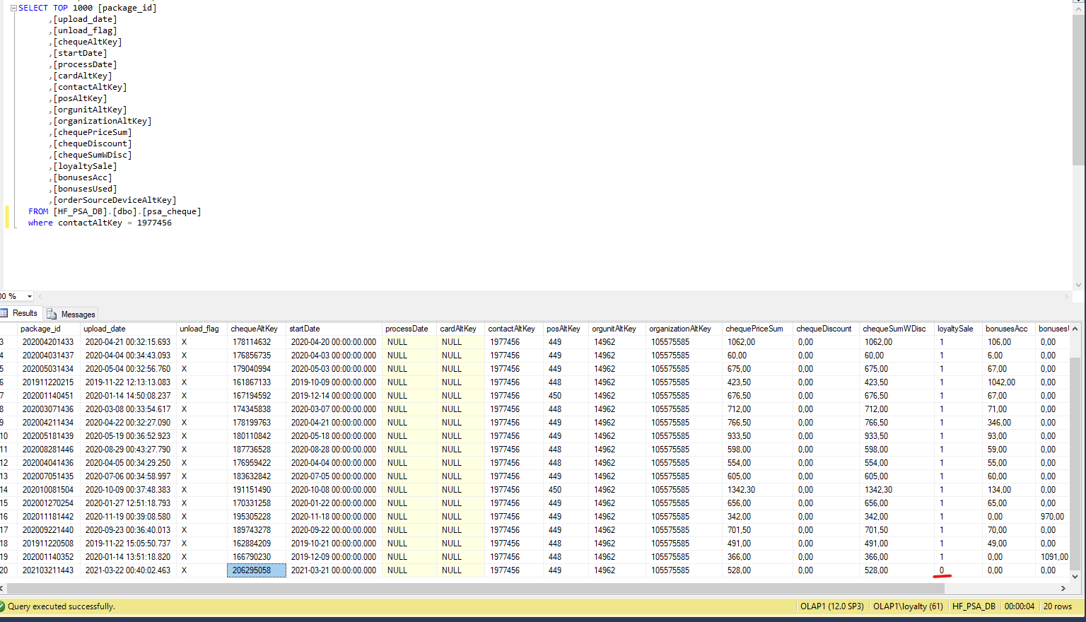 Конкретно, по клиенту ID = '1977456' ,был передан чек ChequeAltKey ='206295058' в таблице Cheque без признака loyaltySale, но при этом в таблице Bonuses по этому чеку было списание бонусов (скрины приложены). Если клиент мог списать бонусы, то почему чек не относится к программе лояльности?