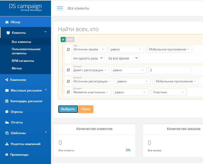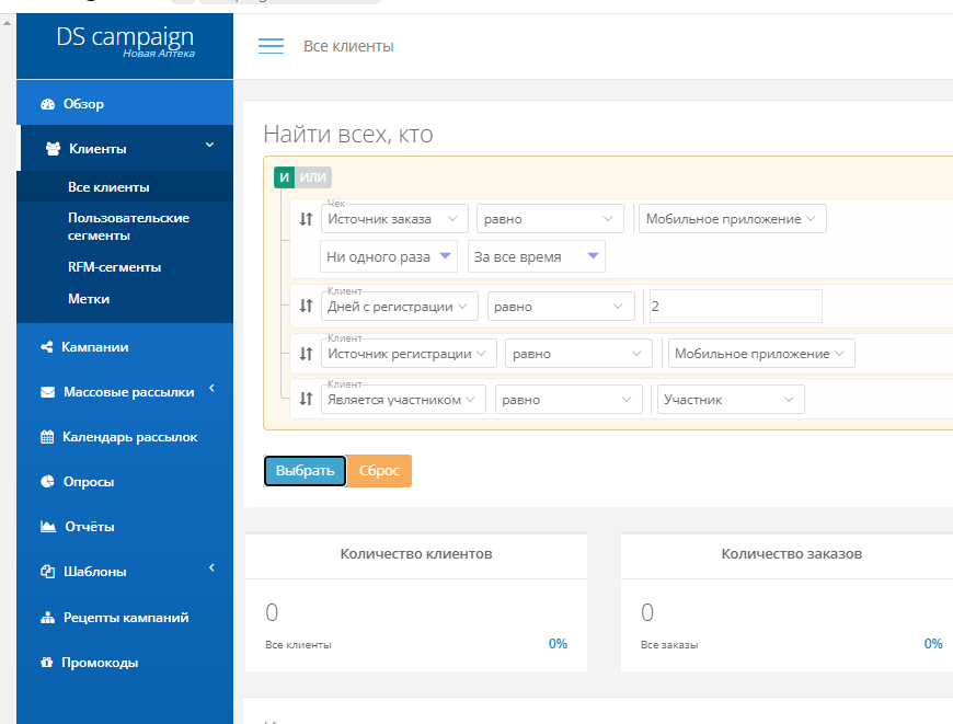 - НА: Триггер push Установили МП, но не сделали заказ НА: нет клиентов удовлетворяющих выборке (скрин).