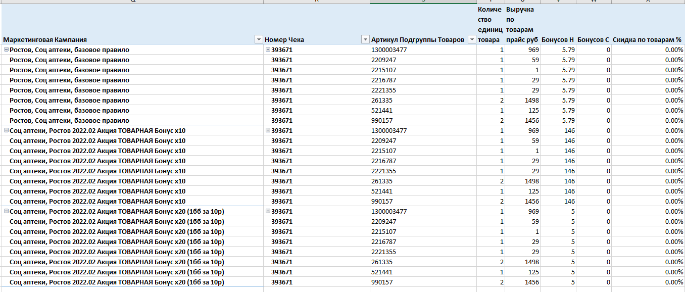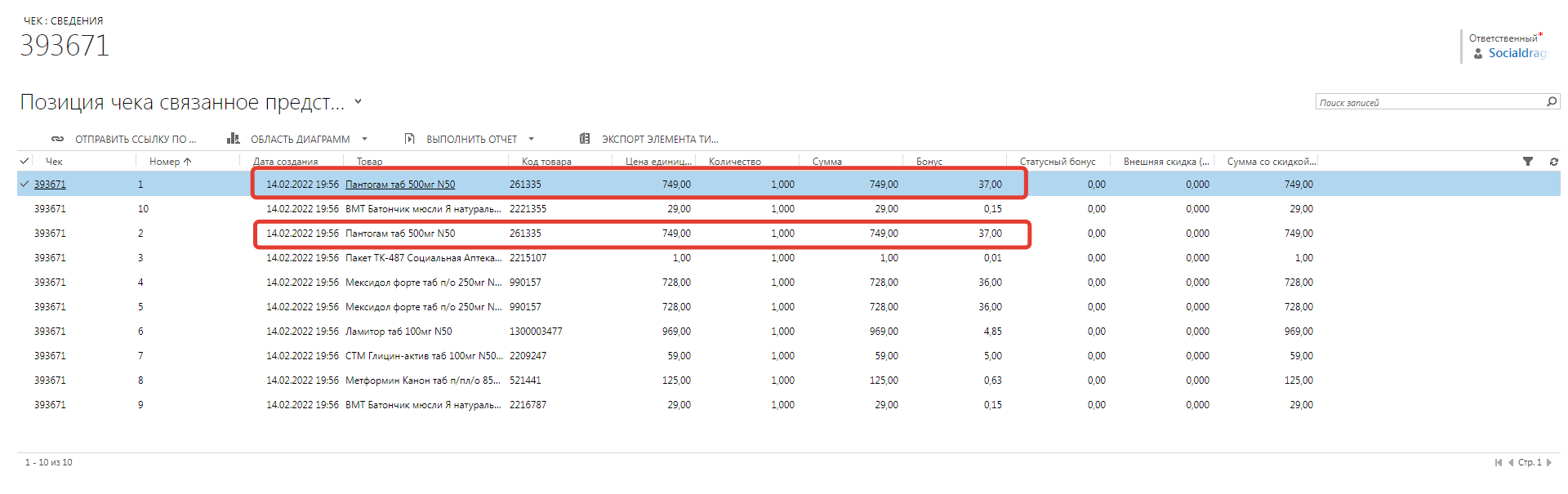 Марина, у вас есть доступ в црм или в кубе, где вы смотрите чек и начисления? Алгоритм один, я все время вам одно и тоже пишу, что бонусы начисляются на каждую позицию, по той схеме что говорила и раньше, кратно 10 беретеся целая часть и умножается на бонус. Посмотрите на структуру этого чека, в чеке 10 позиций.