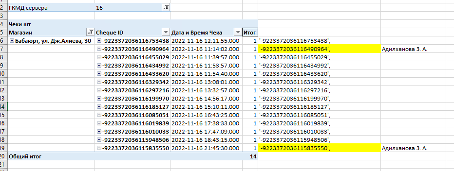 Проверила БД. Большая часть чеков приходит без разметки ФИО кассира. Пример на скрине. Жёлтым отмечены чеки с указанным атрибутом кассир. Остальные пустые.