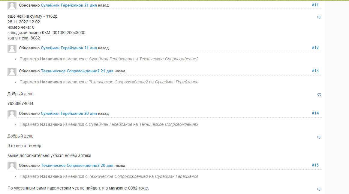 То что суммы которые они передают не совпадают, вот пример из этой же задачи 8276 по телефону 79285225005 просили найти чек на 1400, в то время как в ЦРМ чек на сумму 1450, поэтому сумму чека для поиска мы не указываем, а ищем только по дате и аптеке, чеков при этом выдается около 200-300 среди них и приходится искать уже визуально.