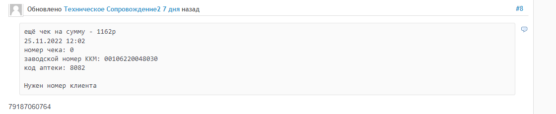 Далее история развивалась так: Сулейман в другой задаче (8343) спросил еще раз про этот же чек и получил номер, но отличный от первого, также прикладываю скрин (фото 2).