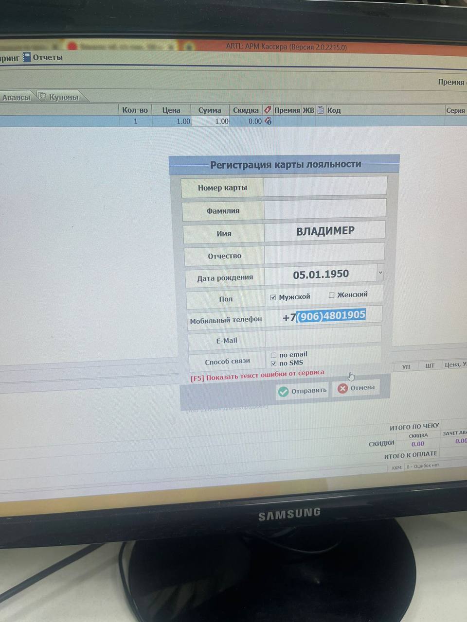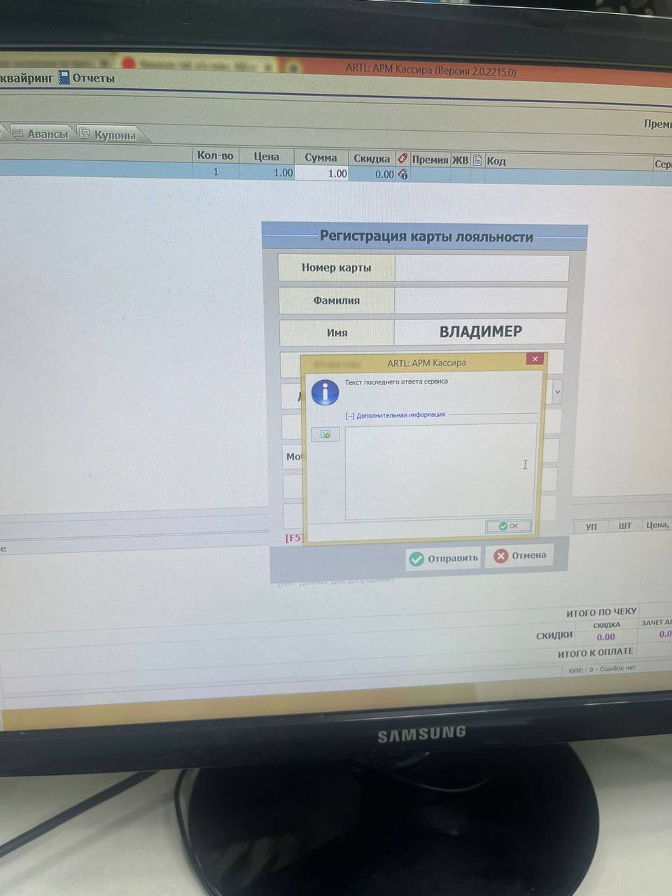 Доброго вечера! В аптеке Гамидова 48 (№ 8024) перестали работать регистрации карт. Прикладываю фото ошибки, которую выдает кассовый аппарат
