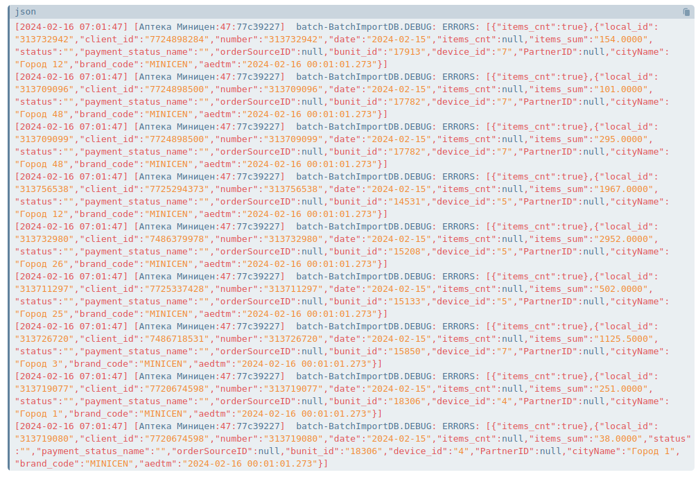 [2024-02-16 07:01:47] [Аптека Миницен:47:77c39227] batch-BatchImportDB.DEBUG: ERRORS: [{"items_cnt":true},{"local_id":"313726720","client_id":"7486718531","number":"313726720","date":"2024-02-15","items_cnt":null,"items_sum":"1125.5000","status":"","payment_status_name":"","orderSourceID":null,"bunit_id":"15850","device_id":"7","PartnerID":null,"cityName":"Город 3","brand_code":"MINICEN","aedtm":"2024-02-16 00:01:01.273"}]